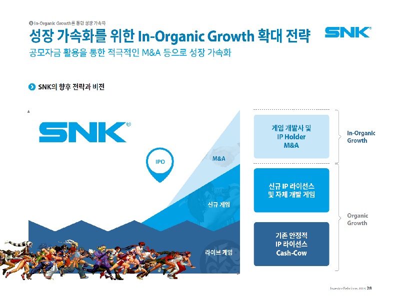 '킹오브파이터즈', '사무라이스피리츠', '메탈슬러그' 등 유명 지적재산권(IP)를 보유한 SNK가 코스닥 상장을 철회했다. 투자자들이 기업가치를 정확하게 평가하기 어렵다는 것이 이유다.