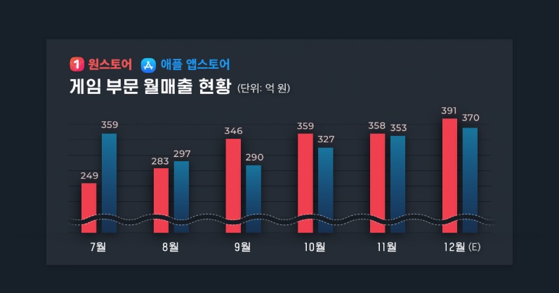 이후 원스토어는 10월에 359억원, 11월 358억원, 12월 현재 391억원 등을 기록하며 꾸준한 상승세를 기록했다. 물론 애플 앱스토어도 10월 327억원, 11월 353억원, 12월 현재 370억원 등 꾸준히 매출을 늘려갔지만 원스토어의 오름세에 밀려, 결국 4개월 연속으로 원스토어보다 게임 매출이 낮았다.