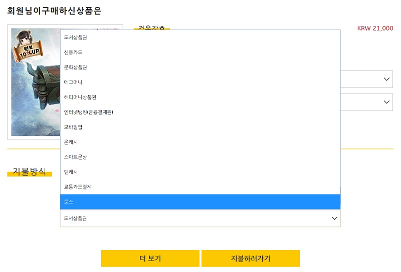 그리고 상품과 결제 방법을 선택하면 결제가 이뤄지는데, 여기에선 최소 금액 상품인 2만원의 900원보 지급 상품을 선택하고 결제 방식으로 문화상품권을 선택했다.