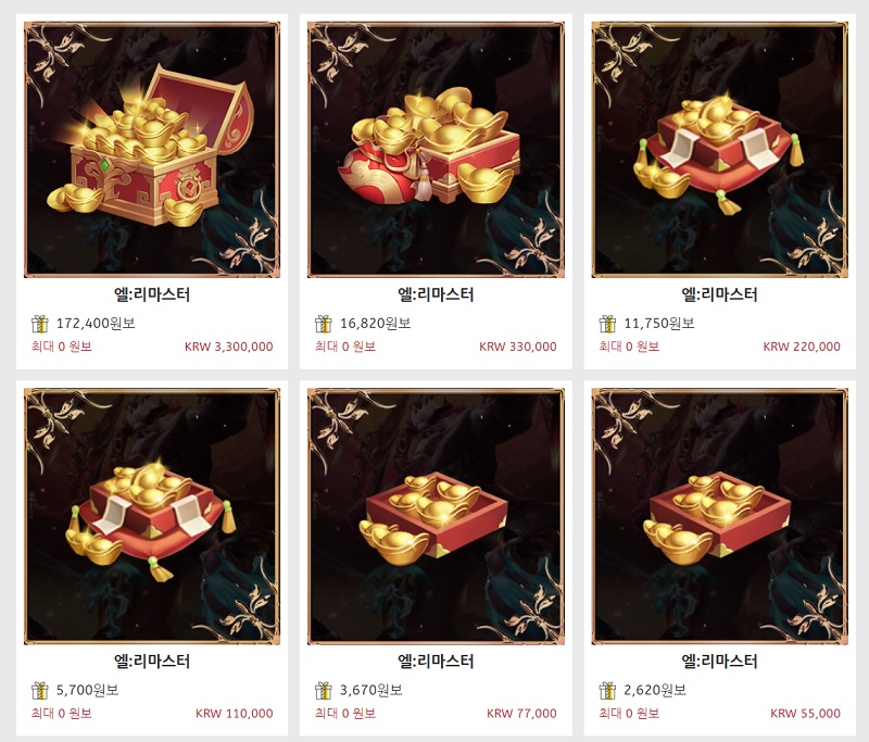 '엘:리마스터'의 웹 충전 상품은 22,000원부터 330만원까지 총 8개의 상품으로 구성되어 있다. 현재 서비스 중인 '검은강호'처럼 재화 충전시 최대 30%까지 더 주는 수준은 아니지만 약 8% 정도의 추가 재화를 지급하고 있는 것으로 확인됐다.