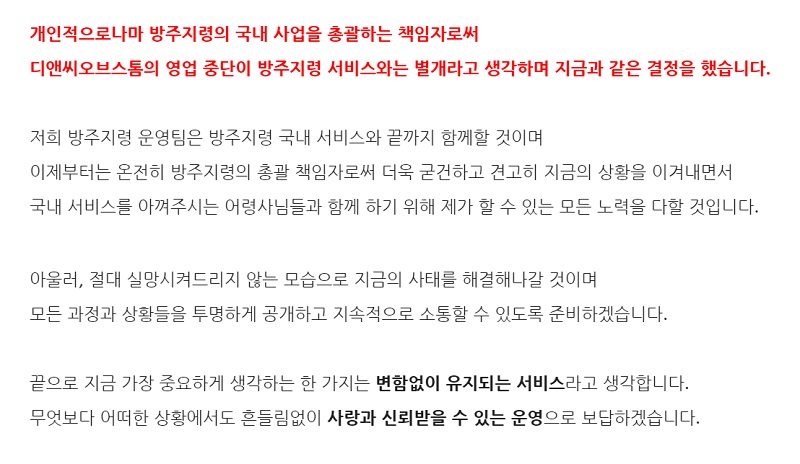 특히 총괄 본부장이 직접 글을 올려 “운영팀은 게임의 국내 서비스와 끝까지 함께 할 것이며, 총괄 책임자로서 굳건하고 견고히 상황을 이겨내며 할 수 있는 모든 것을 하겠다”며 유저들의 믿음을 얻었다. 이후 서비스 이관사가 확정됐고, 관련 인력도 그대로 유지되어 지금은 이관을 앞두고 있는 상태다