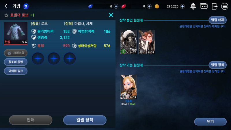 예를 들어 마법사와 사제가 장착 가능한 전설 등급의 로브 아이템의 경우 창기사와 마법사, 사제가 한 파티로 구성됐을 때 이 아이템이 마법사와 사제가 착용한 설정으로 전투에 나가게 된다.