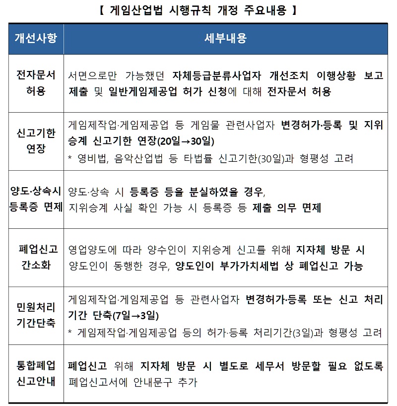 게임사업자의 경우 제작업과 배급업을 통합 등록할 수 있고 신고나 문서, 민원처리 등의 서류 및 행정 절차를 간소화해 편의성을 높일 예정이며, 펀드의 정부 출자 비중을 높이고 특화 보증을 해주는 등의 조치를 통해 만성적 자금 부족에 시달리는 중소 게임사를 도울 예정이다.