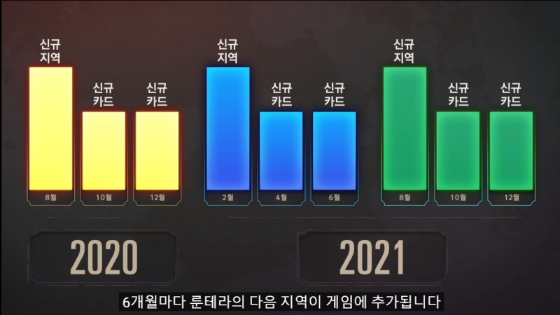 신규 지역과 카드에 대한 업데이트 계획도 소개됐다. LoR은 8월 신규 지역과 관련 카드를 추가하며, 이후 2개월마다 새로운 카드를 선보일 계획이다. 또, 신규 지역을 6개월마다 주기적으로 선보일 계획이다.