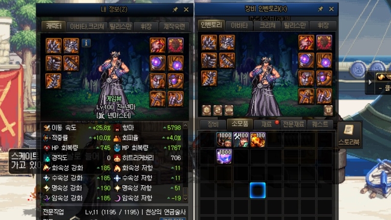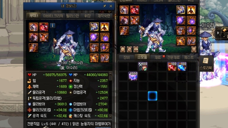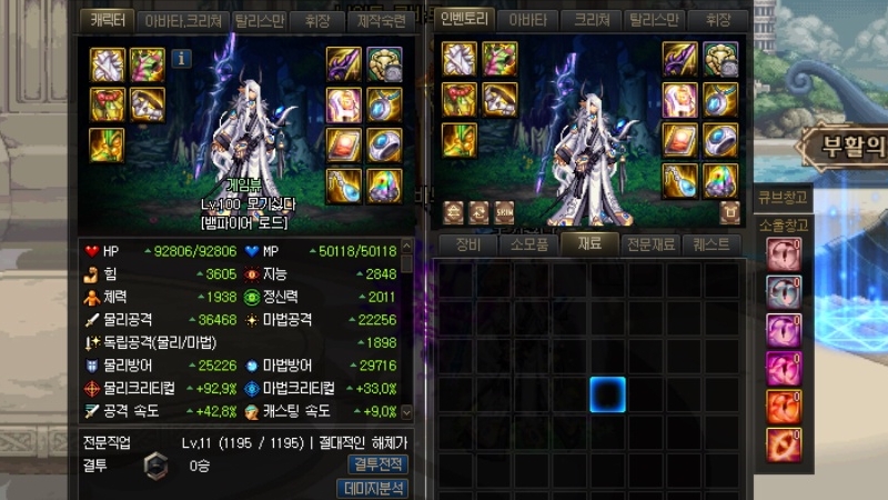 먼저 뱀파이어 로드는 11강 100레벨 에픽 무기와 신화를 포함한 3233 세팅을 마친 상태다. 기본적인 마법부여와 20레벨 버프 스위칭도 챙겼다. 시로코 레이드 시너지 딜러 수준의 스펙을 갖췄다.