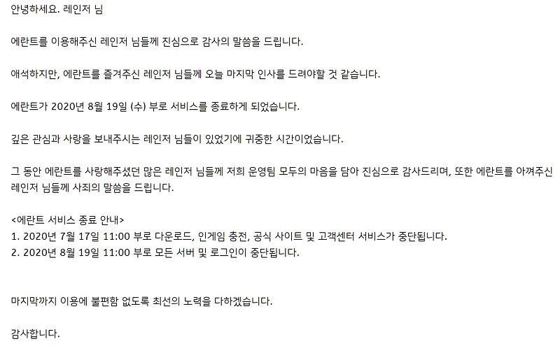 이번에 발표한 공지를 통해 X.D.글로벌 측은 "에란트는 8월 19일부로 서비스를 종료하게 되었다. 그 동안 에란트를 사랑해주셨던 많은 레인저 님들께 저희 운영팀 모두의 마음을 담아 진심으로 감사드리며, 또한 에란트를 아껴주신 레인저 님들께 사죄의 말씀을 드린다."고 밝혔다.