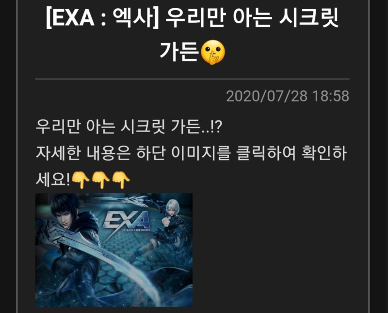 그러나 문구는 자극적이었다. 게임 내 공지사항에는 “우리만 아는 시크릿 가든”이라는 게시물이 상단에 고정되어 있었다. 그리고 이 글 안에는 이미지를 클릭해 자세한 내용을 확인하라며 클릭을 유도하고 있다.