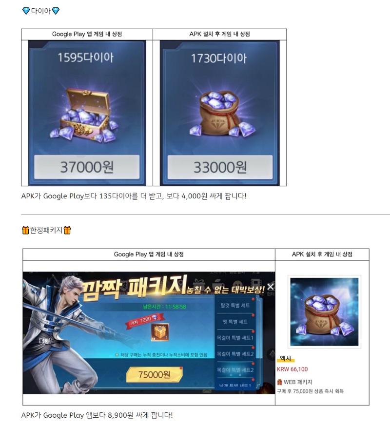 또한 한정 패키지의 경우 구글플레이에서는 75,000원에 팔지만 자사 결제 페이지에서는 66,100원에 파는 만큼 8,900원이 저렴하다고 광고하고 있다.