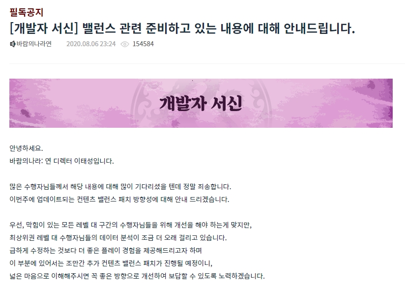 ‘바람의나라: 연’이 큰 사랑을 받고 있다. 7일까지 구글플레이 매출순위 3위를 유지 중이며, 콘텐츠와 사냥의 재미도 호평이 이어지고 있다. 많은 유저가 즐기는 만큼 피드백 양도 상당한 것 같다. 넥슨 ‘바람의나라: 연’ 이태성 디렉터는 6일 공식 커뮤니티 개발자의 서신으로 현재 개발 중인 개선사항과 방향성을 공개했다.