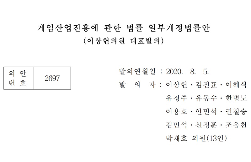 지난 5일 국회에는 게임산업진흥에 관한 법률 일부개정법률안이 접수됐다. 이 법안은 이상헌, 권칠승, 김민석, 김진표, 박재호, 신정훈, 안민석, 유동수, 유정주, 이해식, 조응천, 한병도 의원 등 더불어민주당 소속 의원들과 무소속 이용호 의원 등이 13명의 의원들이 참여했다.
