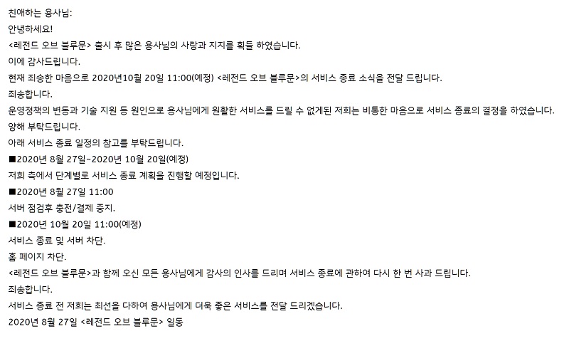 지난 27일 레인보우홀스는 레전드 오브 블루문 공식 카페를 통해 "출시 후 많은 용사님의 사랑과 지지를 얻은 레전드 오브 블루문은 운영정책의 변동과 기술 지원 등 원인으로 용사님에게 원활한 서비스를 드릴 수 없게 된 저희는 비통한 마음으로 서비스 종료의 결정을 했다."며 게임의 서비스가 종료될 예정임을 밝혔다.