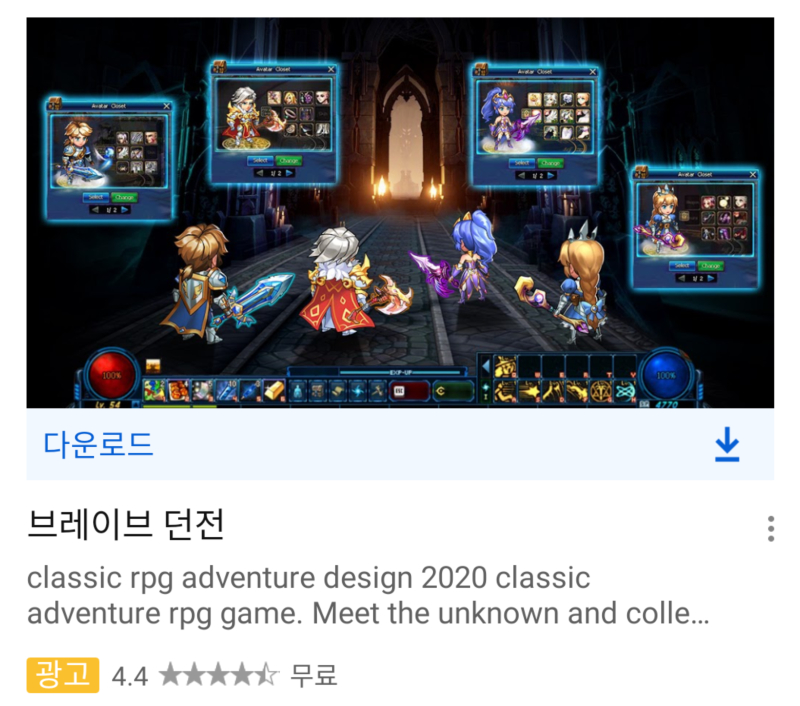하지만 막상 게임을 설치하고 보면, 브레이브 던전은 세로 형태로 즐기는 방치형 자동 전투 게임이다. 광고에 나오는 인터페이스는 전혀 등장하지 않는다. 한 마디로 허위 광고인 셈이다.