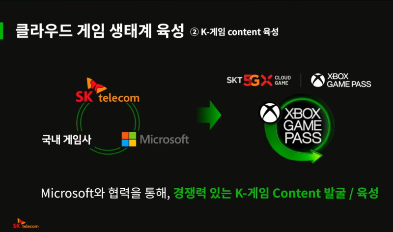 그리고 클라우드의 생태계 육성에도 나선다. SKT는 MS와 협력을 통해 국내 게임사의 게임을 발굴해 Xbox 게임패스를 통해 클라우드 게임으로 글로벌 42개국에 서비스함으로써 한국 게임의 경쟁력을 키운다는 계획이다.