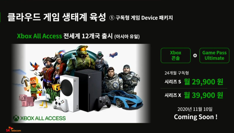 그리고 Xbox 신형 콘솔 기기와 게임패스 얼티밋의 구독 서비스인 Xbox 올 액세스도 아시아에서 유일하게 SKT를 통해 출시된다. Xbox 시리즈 S 상품은 월 29,900원, Xbox 시리즈 X 상품은 월 39,900원을 2년간 납입하는 방식으로 판매된다.