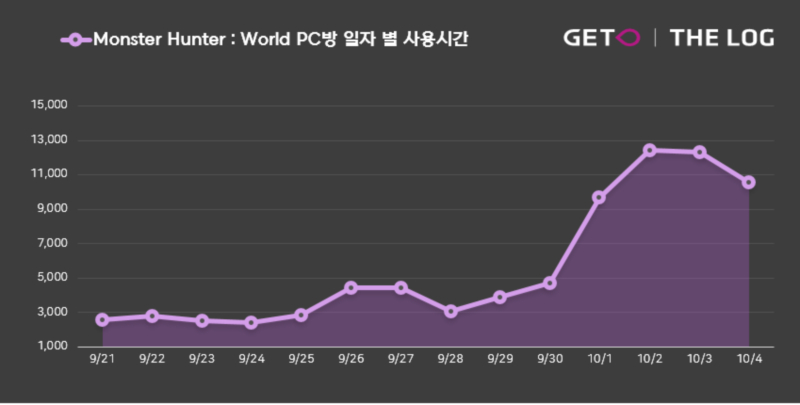 실제로 몬스터헌터 월드의 일일 사용시간 그래프를 보면, 추석 연휴 전까지는 평일 3천 시간대, 휴일 4천 시간대의 이용량을 보였다. 하지만 추석 당일부터 이용량이 급증, 2일과 3일에는 이전의 3배인 1만2천 시간이 넘는 급등세를 보인 것으로 나타났다.