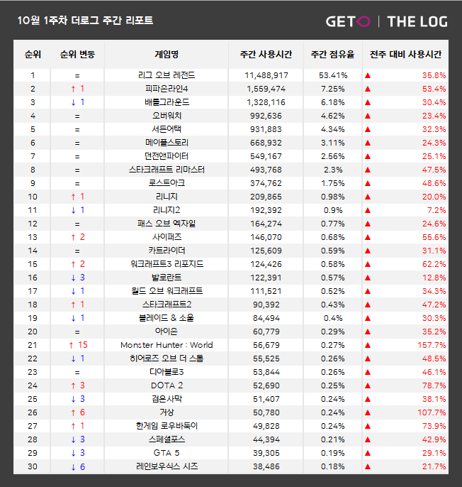 1위를 유지 중인 ‘리그 오브 레전드’는 전주대비 사용시간이 35.8% 증가한 1,148만 시간을 기록해 점유율 53.41%를 차지, 전주보다 점유율을 0.09% 끌어올리며 올해 최고 주간 점유율을 경신했다.