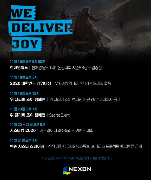 올해 프로그램은 사전 행사와 본 행사로 크게 나뉘어 진행된다. 우리는 즐거움을 배달한다는 뜻의 ‘위 딜리버 조이(WE DELIVER JOY)’ 캠페인이다. 게임 본연의 즐거움을 언제 어디서든 쉽게 누리고, 안전하게 소통할 수 있도록 유저를 찾아간다는 의미를 담았다.