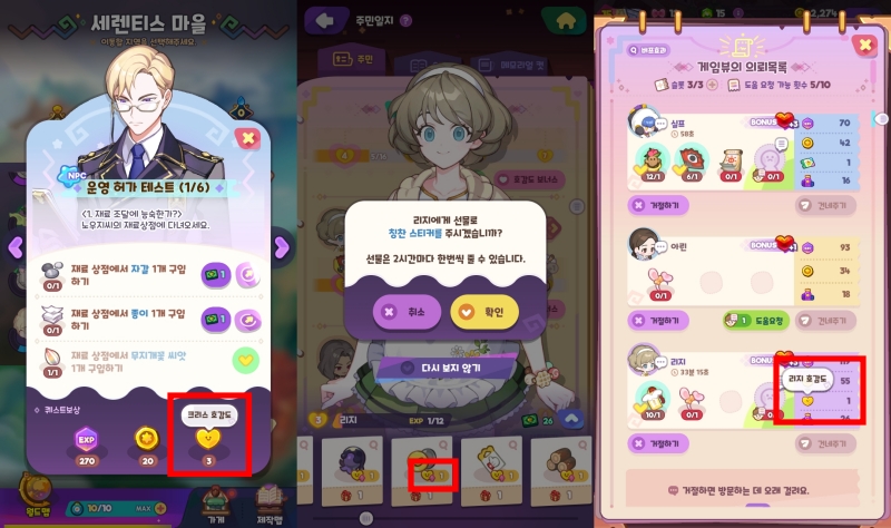 육성에 큰 영향을 주는 만큼 대부분의 유저가 메인 퀘스트를 먼저 수행할 것이다. 이때 NPC 퀘스트를 미루면 손해가 크다. 캐릭터의 호감도가 보상으로 걸렸기 때문이다. 가끔 의뢰 목록에 NPC 의뢰가 포함되는 경우가 있지만, 확률이 그다지 높지 않다. 빠르게 호감도를 높이려면 NPC 퀘스트를 꼭 먼저 처리하자. 추가로 NPC의 집 혹은 매장을 방문해 선물을 주면 호감도를 높일 수 있다. 선물은 2시간마다 할 수 있다.