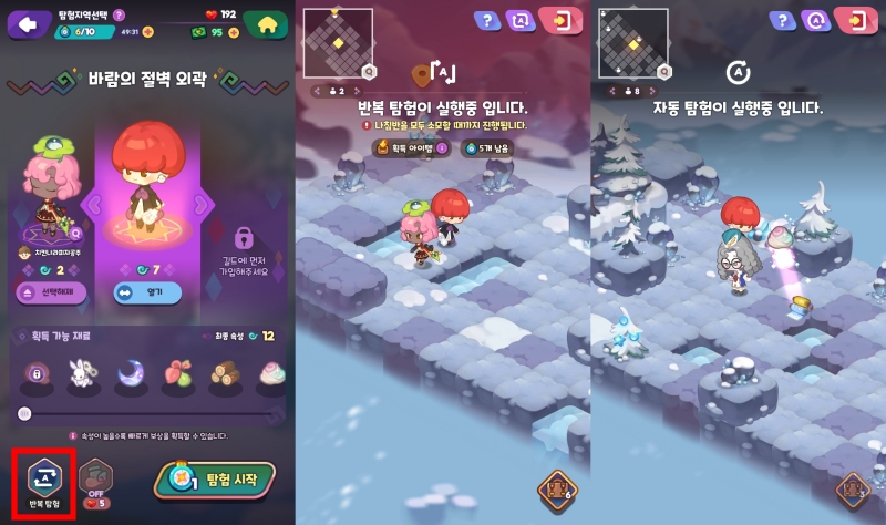 탐험은 자동 모드를 지원하지만, 효율을 따지면 직접 플레이하는 편이 낫다. 재료를 채집하는 시간이 크게 다르기 때문이다. 속성이 부족한 초반에는 좋은 재료를 찾아도, 자동 모드로는 제대로 채집할 수 없다. 수동으로 직접 터치하고 스와이프하며 채집해야 더 많은 재료를 얻을 수 있다. 참고로 준비화면에서 자동탐험을 두 번 터치하면 반복 탐험으로 바뀐다.