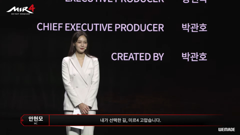 한편, 쇼케이스 마지막에 위메이드 박관호 의장의 이름이 등장한 것는 것이 눈에 띈다. 미르4에 참여한 모든 관계자들의 이름이 크레딧으로 스크롤되는 것으로 쇼케이스 영상이 마무리되는데, 여기에 박관호 의장의 이름이 적힌 것.