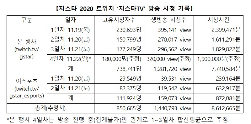 지스타 기간 트위치 ‘지스타TV’를 다녀간 고유시청자는 총 850,665명(추정치)으로 집계 됐다. 고유시청자는 지스타TV를 방문한 개별 시청자 수이다. 한편, 트위치 ‘지스타TV’ 채널 팔로워 수는 1만을 돌파했다.