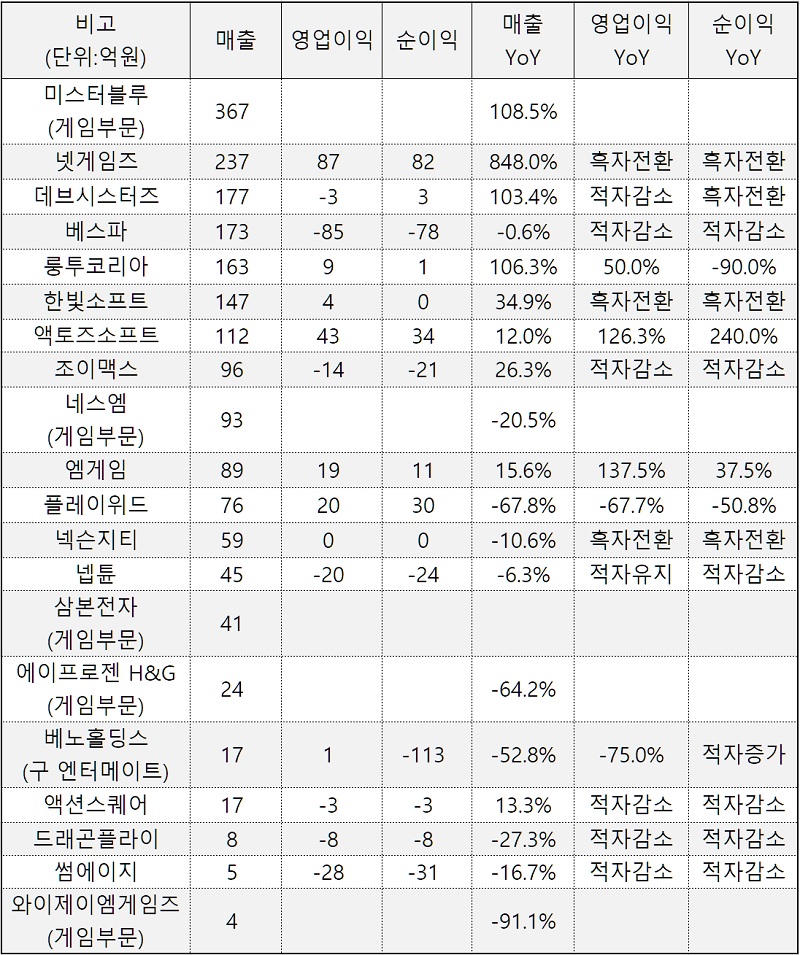 국내 주식시장에 상장되어 지난 2분기에 매출 200억 이하를 기록한 중소형 게임사들의 2020년 3분기 실적 발표가 마무리됐다.