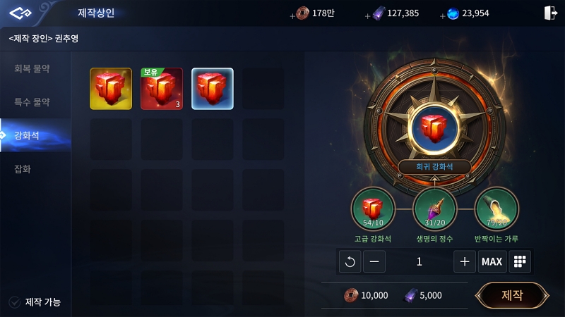 희귀 강화석을 만드는 데 필요한 재료는 고급 강화석 10개, 생명의 정수 20개, 반짝이는 가루 20개다. 강화석은 40레벨 이하 지역에서 반복 사냥으로 비교적 쉽게 얻을 수 있다. 비천성 잡화 상인에게 개당 동전 1,000개로 최대 20개까지 구입할 수도 있으니 참고하자.
