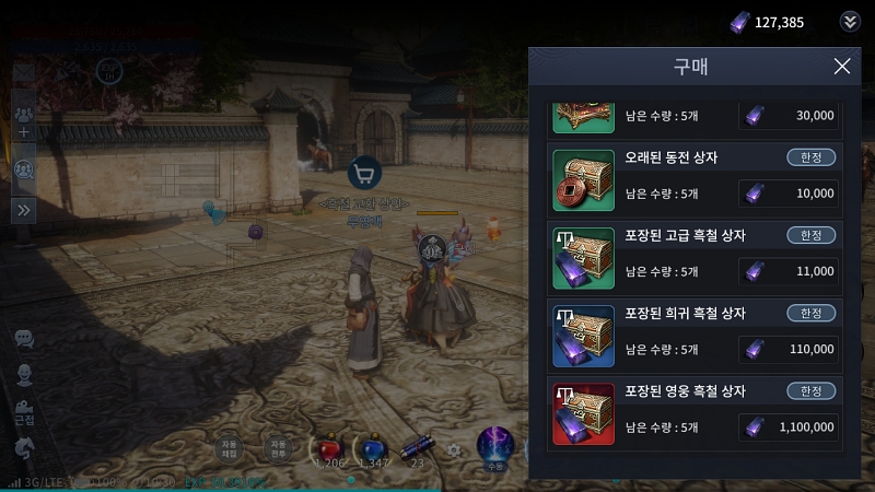 교환불가 재화인 흑철을 포장해 거래가능으로 바꿔주는 흑철 상자도 판매한다. 흑철 1만개, 10만개, 100만개 상자를 각각 5번 구입할 수 있고, 수수료 명목으로 10% 비싸게 판매 중이다. 10만개 상자는 거래소에서 130금화(천도 04서버 기준)로 팔 수 있으니, 급하게 금화가 필요한 유저라면 흑철을 꾸준히 모아 파는 것도 도움이 된다.