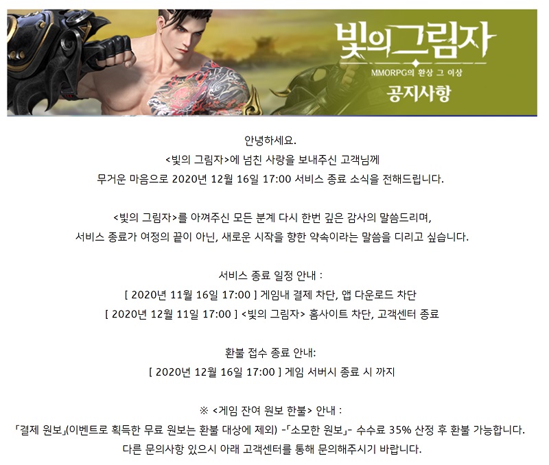 나이스플레이는 지난 18일 자사가 서비스하던 모바일 MMORPG ‘빛의 그림자’ 공식 카페에 공지를 올려 서비스 종료에 대해 알렸다. 보통 이렇게 종료 공지가 올라오게 되면 이때부터 결제와 게임 다운로드가 불가능해지고 한 달 뒤에 서비스를 종료한다고 알리는 것이 일반적이다.