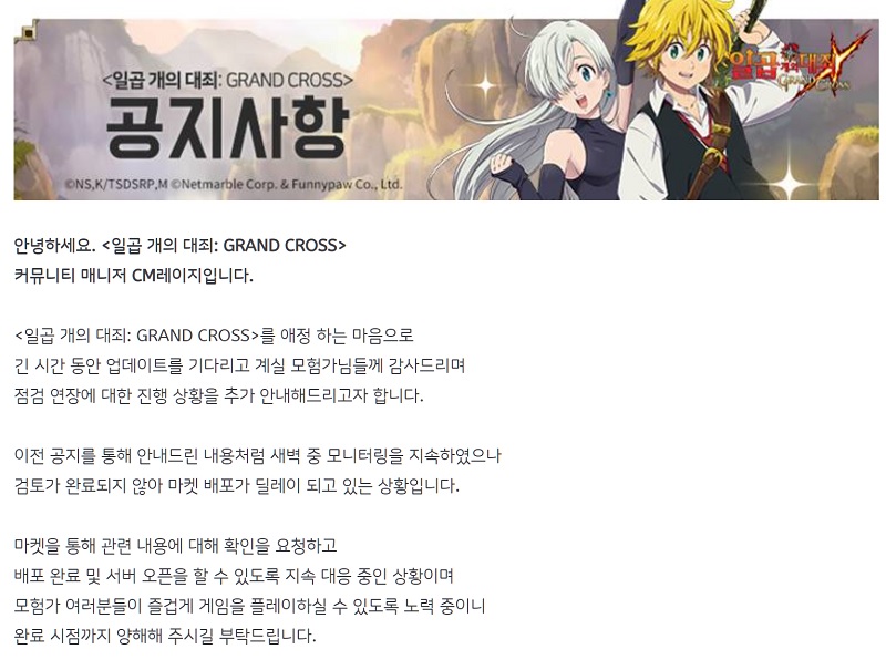 넷마블의 주요 흥행 게임으로 자리잡은 모바일 RPG '일곱개의 대죄 : 그랜드 크로스'의 서비스가 만 하루가 넘게 중단되고 있다. 문제는 넷마블의 잘못이 아닌 구글의 잘못 때문이다.