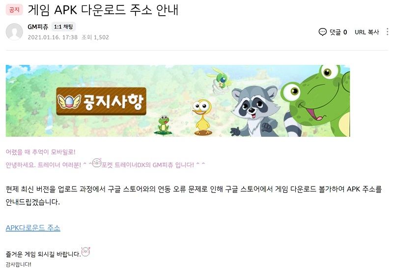 서비스사 측은 지난 16일 공식 카페를 통해 “최신 버전을 업로드하는 과정에서 구글 스토어와의 연동 오류로 인해 게임 다운로드가 불가해 APK 다운로드 주소를 안내한다”며 설치 파일을 별도로 받아 게임을 즐겨줄 것을 알렸다. 문제가 되는 부분을 철저히 숨기고 있는 것.
