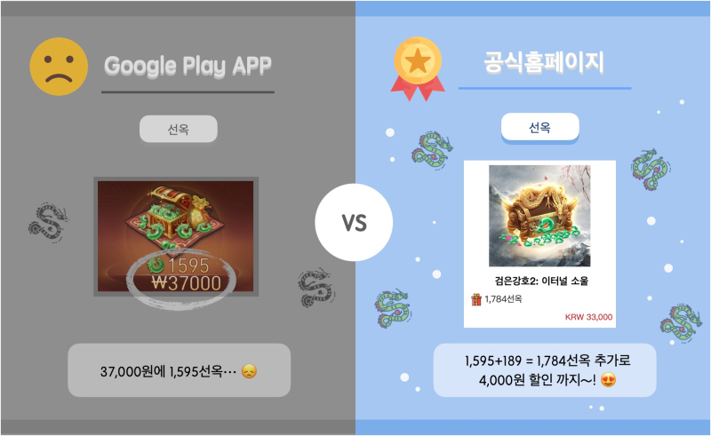 예를 들어 구글이나 애플에서는 37,000원 패키지를 사면 1,595선옥을 지급하지만, 공식 홈페이지에서는 33,000원 패키지를 사면 1,748선옥을 얻을 수 있다고 안내하고 있는 것. 명백한 외부 결제 유도이며 각 플랫폼사의 규정 위반이다.