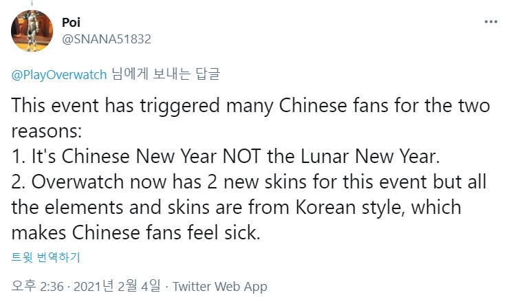 중국 유저들은 "이번에 추가된 스킨이 한국 스타일을 갖추고 있기 때문에 중국 유저들이 오버워치에 실망하고 있다"며 "한국의 설날은 중국의 춘절을 베낀 것이기 때문에 음력 설(Lunar New Year)이 아니라 춘절(Chinese New Year)로 표기해야 한다"는 글을 남겼다.