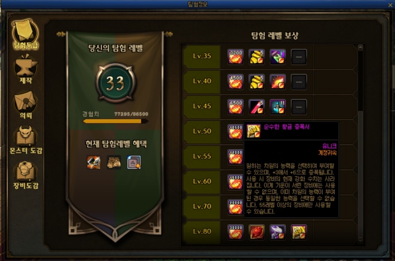 굳이 에테르나 시너지 장비를 파밍하지 않더라도, 탐험 등급은 높여두는 편이 좋다. 등급 별로 쓸만한 아이템을 얻을 수 있기 때문이다. 가격 대비 효율이 높은 마법부여 보주는 육성 단계 캐릭터에게 부여하기 좋다. 최고 레벨인 80을 달성하면 순수한 황금 증폭서 하나를 확정으로 얻을 수 있다. 일반적으로 얻기 힘든 최고급 아이템인 만큼 필요한 유저라면 에테르나로 모험을 떠나보자.
