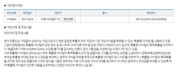 유동수 의원은 개정안을 발의한 취지에 대해서 “현재 유통되는 게임물의 상당수는 게임사업자가 정한 일정한 확률에 따라 게임머니 및 게임아이템을 획득할 수 있는 확률형 아이템을 사용하고 있다”라며 “그런데 현행법에는 확률형 아이템에 관한 정의 및 표시의무, 이에 따른 제재 등 관련 규정이 마련되어 있지 않으며, 확률형 아이템의 획득 확률을 조작하거나 ‘컴플리트 가챠’를 금지하는 조항이 없어 사행성을 조장한다는 의견이 제기되고 있다”라고 전했다.