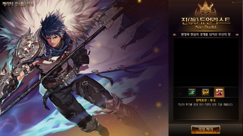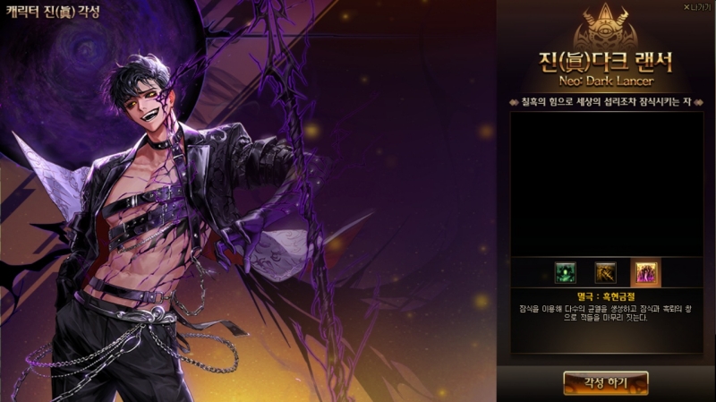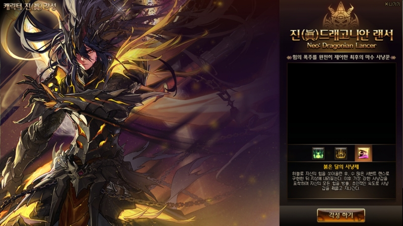 95레벨 진각성 패시브를 익히면 절명창과 다크 베리얼의 공격 효과가 변경된다. 절명창은 백스탭과 점프 상태에서 스킬 시전이 가능해진다. 적과 거리를 벌리는 것과 동시에, 상당히 길었던 시전 모션을 생략하는 효과가 추가되는 것이다. 다크 베리얼은 창을 던지는 첫 모션이 사라져 공격 타임이 상대적으로 짧아졌다. 따라서 진각성 이후에는 절명창 혹은 다크 베리얼 중 하나를 기본기로 사용하는 등 스킬 포인트 분배를 연구할 필요가 있다.