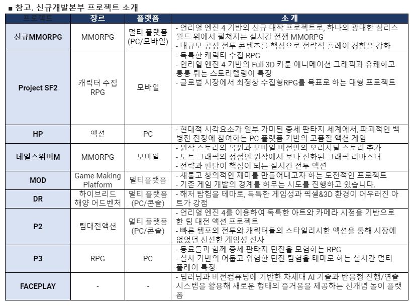 그동안 넥슨은 신규 프로젝트 발표에 신중을 기했다. 매 분기 실적발표 파이프라인에서도 퍼블리싱 게임을 제외하면 타이틀이 늘어나지 않았다. 이런 상황에서 9종의 신작 프로젝트가 발표했다는 것은 내부 정리와 준비가 일단락된 신호로 풀이된다.