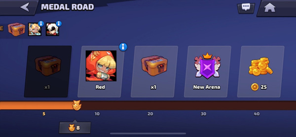 메달 로드를 통해 플레이어는 다양한 보상을 수령할 수 있다. 플레이어가 획득한 메달 전체 수량 합산에 따라 보상이 주어진다. 메달 수량에 따라 총 7개의 리그로 나뉘어져 있으며 신규 캐릭터 획득, 아레나 언락, 코인, 스매시 상자 등의 보상 획득 가능하다