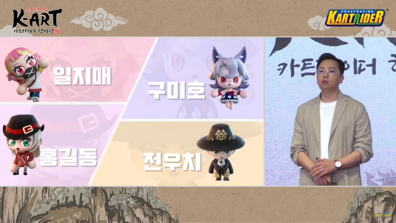 세 개의 테마 콘텐츠는 시나리오 모드로도 즐길 수 있다. 구미호와 전우치로 ‘카트라이더’ 속 한국과 신화 여행을 즐기며, 개성적인 BGM 등 유저가 사랑했던 모든 것을 코리아 테마에 녹여내 볼거리와 즐길 거리가 더욱 풍성할 것이라는 설명이 뒤따랐다.