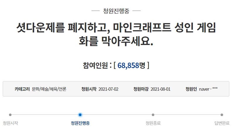 이때문에 청와대 국민청원 게시판에는 셧다운제를 폐지하고 마인크래프트의 성인 게임화를 막아달라는 청원에 갑자기 사람이 몰려 시작 4일만에 7만 명에 육박하는 국민들이 참여, 역대 게임 관련 청원 중 가장 많은 인원이 서명하고 있다. 이대로라면 4주 내에 20만 명은 충분히 달성할 것으로 보인다.