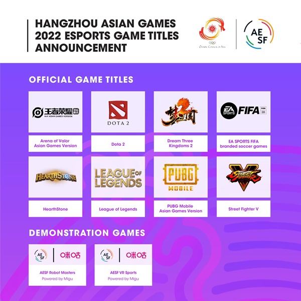 2022 항저우 아시안 게임에 정식으로 포함된 e스포츠 종목이 공개됐다. ‘리그 오브 레전드’, ‘하스스톤’, ‘Arena of Valor’(‘왕자영요’), ‘도타2’, ‘Dream Three Kingdoms2’, EA의 축구 게임 ‘FIFA’, ‘배틀그라운드 모바일’, ‘스트리트 파이터5’ 이상 8개 게임이 이름을 올렸다.