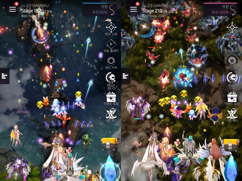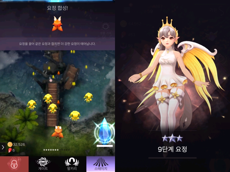 그리고 이 부분에서 ‘발키리 러시’는 다른 게임과의 차별화를 시도했다. 얼마 전부터 트렌드가 된 머지(Merge) 개념을 결합한 것. 크리스탈을 눌러 소환되는 요정은 1단계의 요정이다. 그리고 등장한 2명의 1단계 요정을 손가락을 끌어 합치면 2단계 요정으로 진화한다.