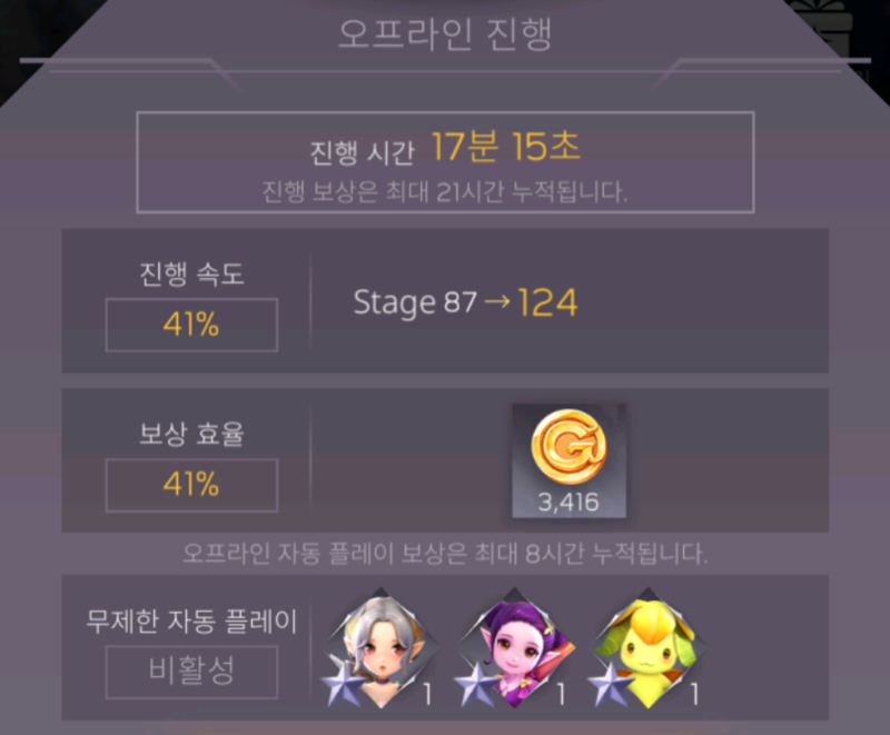이 부분을 편하게 하기 위한 기능이 바로 자동 플레이인데, 광고 혹은 재화를 소모해서 하루에 이 기능을 2~30분 동안 정해진 횟수만큼 사용하게 되면, 다음 날까지 이 기능을 사용할 수 없다.