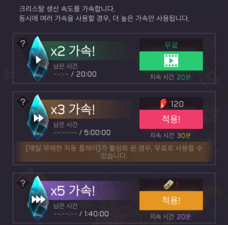 먼저 크리스탈의 생산 시간을 단축하는 부분이다. 생산 속도를 2배와 3배, 5배 빠르게 할 수 있는 상품이 있는데, 이중 2배 가속은 광고 시청으로 할 수 있는 만큼 유저에게 부담없고 다양한 선택권을 준다.