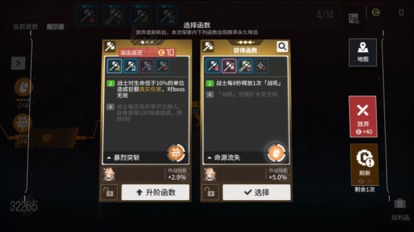 로그라이크 요소는 무작위로 나오는 버프라는 형태로 구현됐다. 한 맵은 여러 스테이지로 나눠져 있고, 한 스테이지를 완료하면 무작위 버프(카드)를 선택할 수 있다. 이런 버프가 모여서 캐릭터들은 해당 맵 한정으로 점점 더 강력해진다. 버프는 같은 버프를 모으면 더 강해지며, 중간에 나오는 상점에서 코인을 소모해서 더 강력하게 만들 수도 있다. 그때그때 자신이 보유한 캐릭터와 잘 어울리는 버프를 취사 선택하면 어렵지 않게 맵을 완료할 수 있다.
