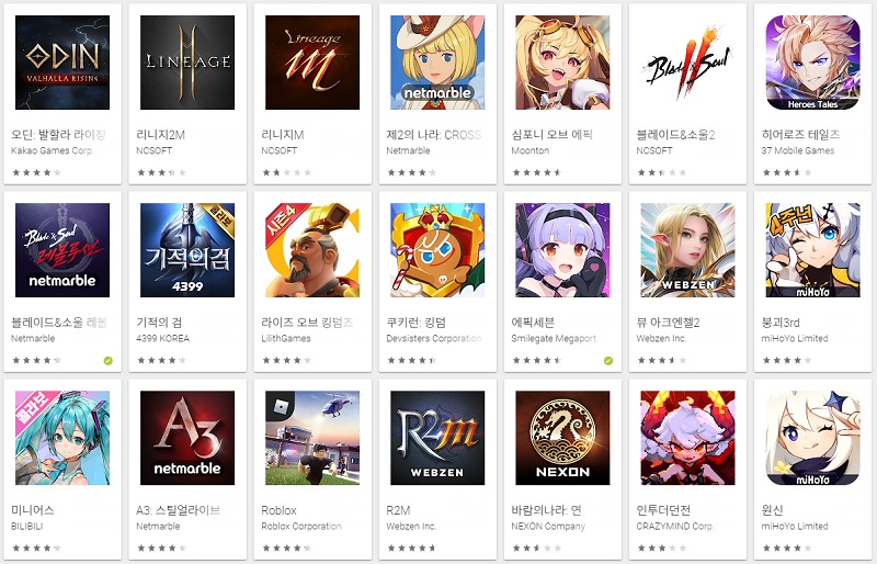 현재 구글 플레이스토어 기준으로 부동의 1위는 ‘오딘:발할라라이징’이며 그 뒤로 엔씨소프트의 ‘리니지2M’과 ‘리니지M’, 그리고 ‘블레이드&소울2’와 넷마블의 ‘제2의 나라’, ‘블레이드&소울 레볼루션’이 자리하고 있다.