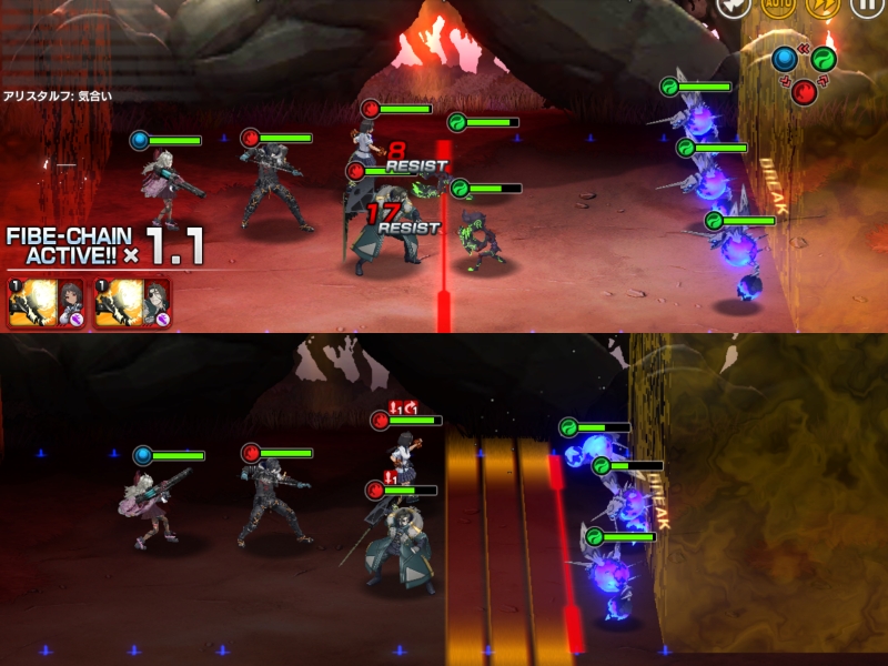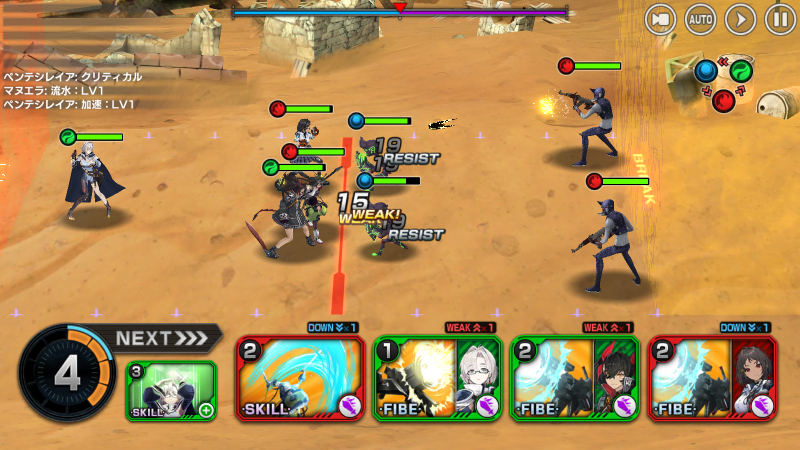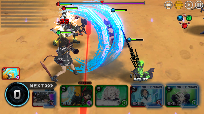 그리고 만약 전투 중 아군 한 명이 전투 불능 상태가 되면 배치되는 스킬 카드의 숫자도 감소한다. 즉, 전투 중인 파티 구성원의 숫자만큼 스킬 카드가 표시된다. 전투의 편의를 위해 배속 기능과 오토 기능도 지원해 스펙이 충분하다면 오토로 돌려도 된다.