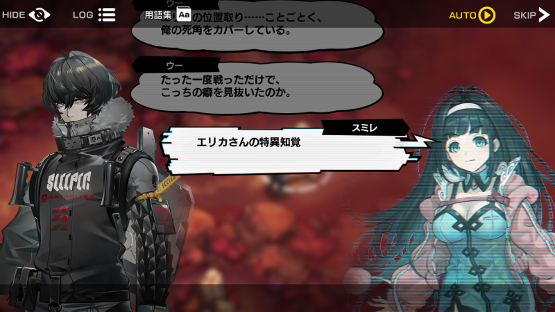 그리고 대화 중에는 스토리에 등장하는 고유의 용어들이 등장하는데 이 부분은 붉은 색으로 표시된다. 그래서 만약 이해가 가지 않는 유저가 있을 수 있는 만큼 대화창 위에 용어집 메뉴를 통해 고유 용어를 이해할 수 있도록 했다.