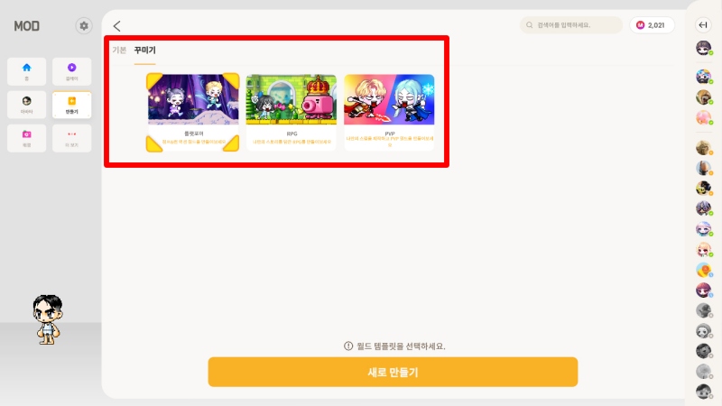 테스트 계정으로 접해본 ‘프로젝트 MOD’는 생각보다 완성도가 높았다. 먼저 일반 게임 제작 툴과 비슷한 인터페이스를 제공하는 기본 모드와 위지윅(WYSIWYG) 그래픽 인터페이스 기반의 꾸미기 모드로 다양한 것들을 만들 수 있었다. 꾸미기 모드는 플랫포머(점프 게임), RPG, PVP 세 개의 장르의 기본적인 형태가 프리셋 형태로 제공된다. 여기에 각종 함정과 맵 디자인을 통해 간단한 게임을 빠르게 구현할 수 있었다.