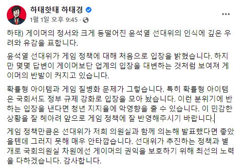 한편, 이번 서면 인터뷰에 대해서 국민의힘 하태경 의원도 자신의 심경을 밝혔다. 그는 지난 1일 자신의 페이스북을 통해 “게이머의 정서와 크게 동떨어진 윤석열 선대위의 인식에 깊은 우려와 유감을 표한다”라며 “게임 정책만큼은 저희 의원실과 의논해 발표했다면 좋았을 텐데 매우 안타깝다”라고 전했다. 그리고 윤석열 후보의 페이스북 글이 올라온 이후에는 “게임 정책이 지금이라도 바뀌어 다행이다. 앞으로도 더 나아지는 모습 모여드리겠다”라고 말했다.